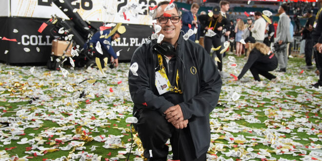 Noah Winter, responsible for the confetti displays, poses for a picture after the College Football Playoff national championship game, Monday, Jan. 19, 2026, in Miami Gardens, Fla. (AP Photo/Rebecca Blackwell)