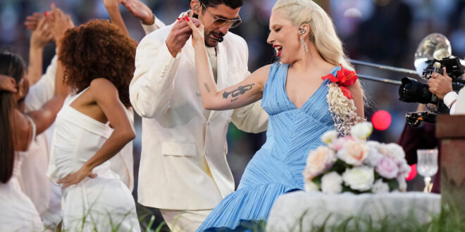 The scene shifted to a wedding, where the seemingly marrying couple parted to reveal Lady Gaga as the first surprise guest. She joined Bad Bunny in performing “Baile Inolvidable.” Gaga did her own Super Bowl halftime show in 2017.