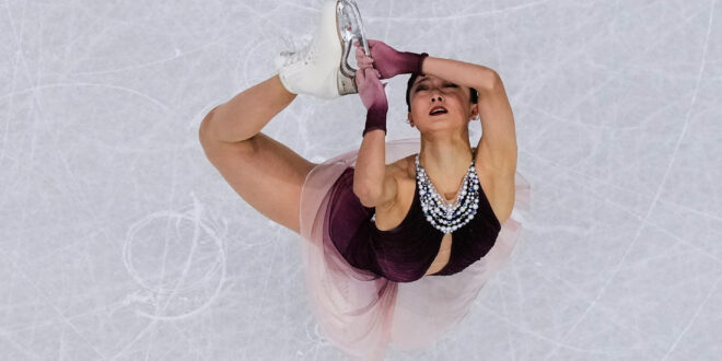 Kaori Sakamoto of Japan competes during the figure skating women's team event at the 2026 Winter Olympics, in Milan, Italy, Sunday, Feb. 8, 2026. (AP Photo/Bernat Armangue)
