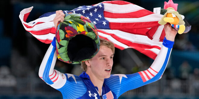 Stolz needed to hold off on a celebratory lap with a U.S. flag until another competitor got the chance for a re-skate, then soon enough was able to smile while leaning forward to receive his gold for winning the men’s 1,000 meters at the Milan Cortina Games in an Olympic-record time thanks to a blistering closing stretch.