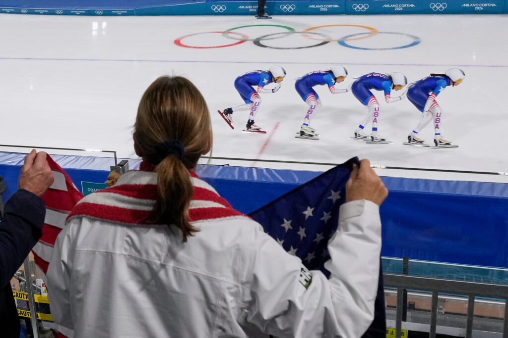 Fans watch team U.S.A. practise ahead of the women’s team pursuit quarterfinals speedskating race at the 2026 Winter Olympics, in Milan, Italy, Saturday, Feb. 14, 2026. (AP Photo/Luca Bruno)