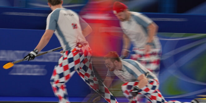 Norway's Martin Sesaker, Bendik Ramsfjell, Gaute Nepstad in action during the men's curling round robin session against Sweden at the 2026 Winter Olympics, in Cortina d'Ampezzo, Italy, Tuesday, Feb. 17, 2026. (AP Photo/Fatima Shbair)