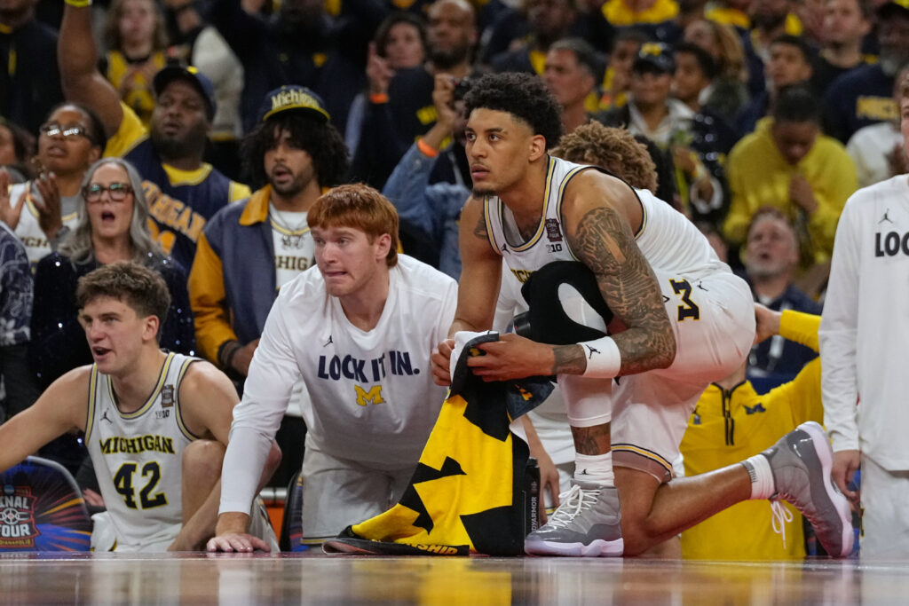Michigan’s Yaxel Lendeborg watches from the bench during the second half of the NCAA college basketball tournament national championship game against UConn at the Final Four, Monday, April 6, 2026, in Indianapolis. (AP Photo/Michael Conroy)